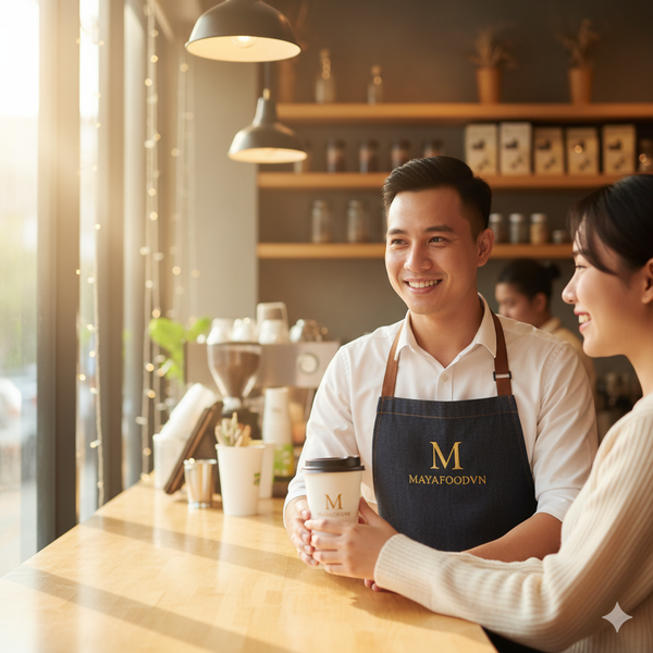 Nhân viên phục vụ thân thiện, chuyên nghiệp trong không gian quán thương hiệu F&B