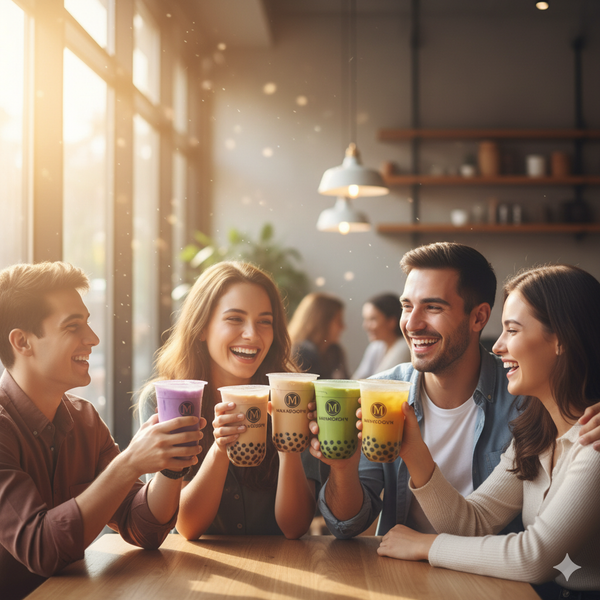 Nhóm khách hàng vui vẻ cầm ly trà sữa thương hiệu F&B trong quán hiện đại