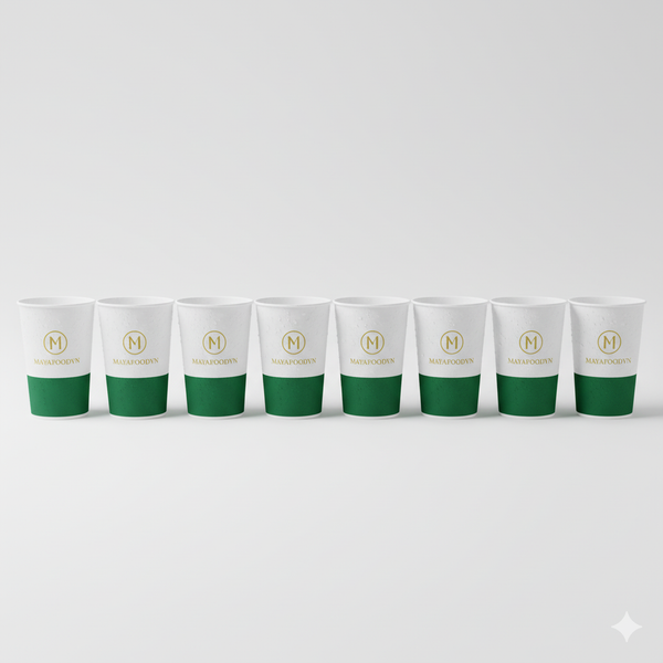 Nhiều ly giấy có logo và màu sắc đồng bộ thể hiện nhận diện thương hiệu chuyên nghiệp của MAYAFOODVN