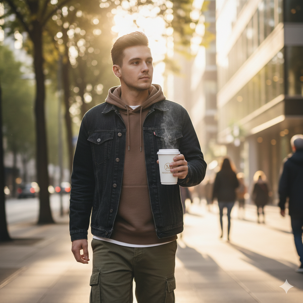 Khách hàng cầm ly giấy mang đi trên phố, thể hiện phong cách sống hiện đại và tiện lợi